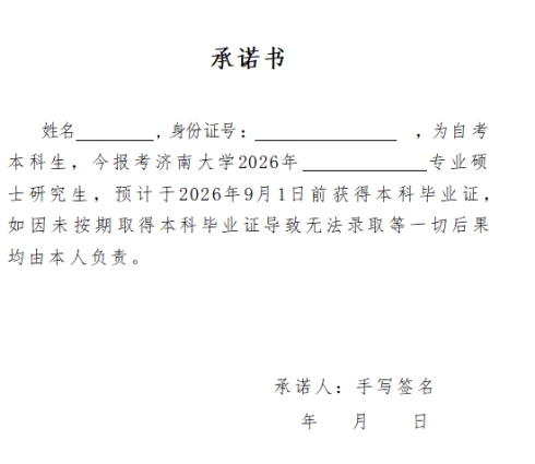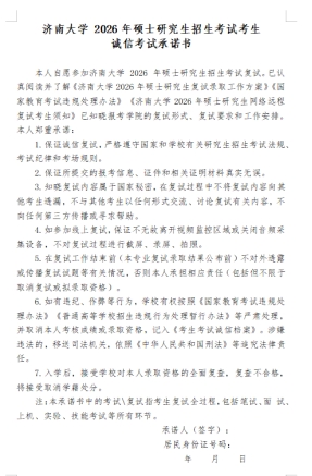 请考生自行打印《济南大学硕士研究生招生考试考生诚信考试承诺书》,仔细阅读后签名并拍照上传。